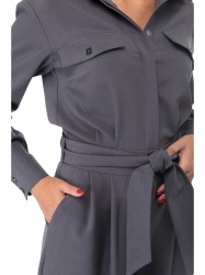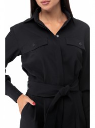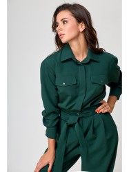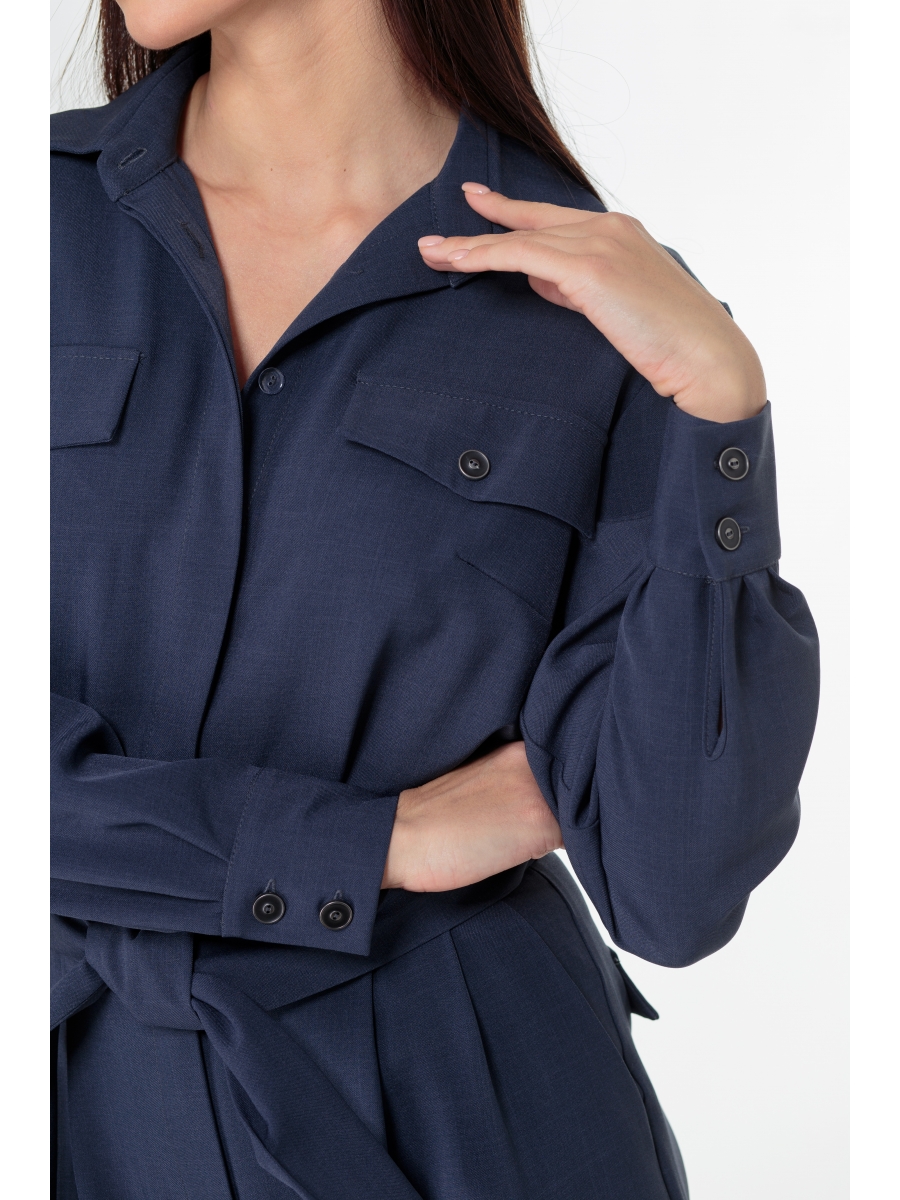 Комбинезон полуприлегающего силуэта, на передних частях обработаны нагрудные вытачки и клапаны, потайная застежка планка на петли и пуговицы, спинка с кокеткой, по центру складка на свободу движения.