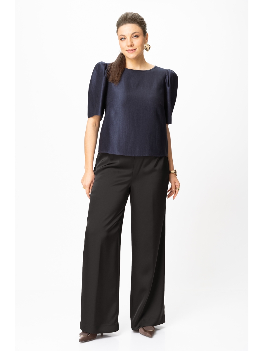 Блузка свободного силуэта из плательной ткани с блеском. Горловина круглая, по спинке в центральном шве разрез возле горловины с завязками. Рукава втачные с объемными складками по откату.