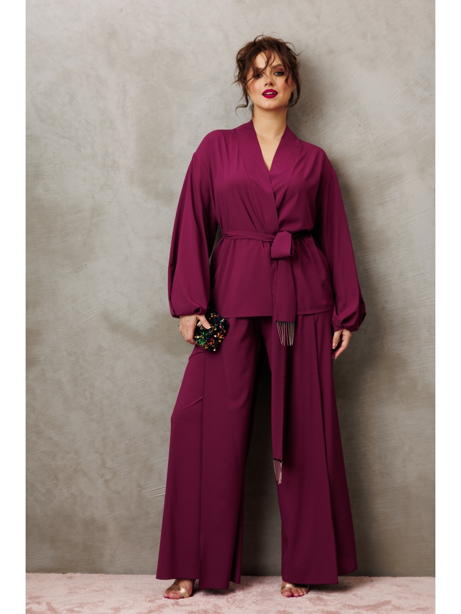 Элегантный вечерний костюм-двойка, состоящий из блузки свободного кроя и широких брюк.