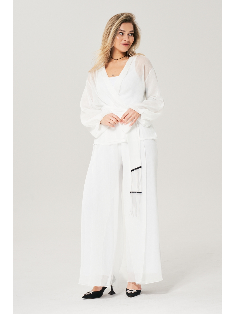 Блузка прямого силуэта из шифона жатка со пущенной линией плеча. Рукав двойной, расширенный к низу со складками. По спинке и полочке идет планка. В комплекте с блузкой идет съемный пояс.