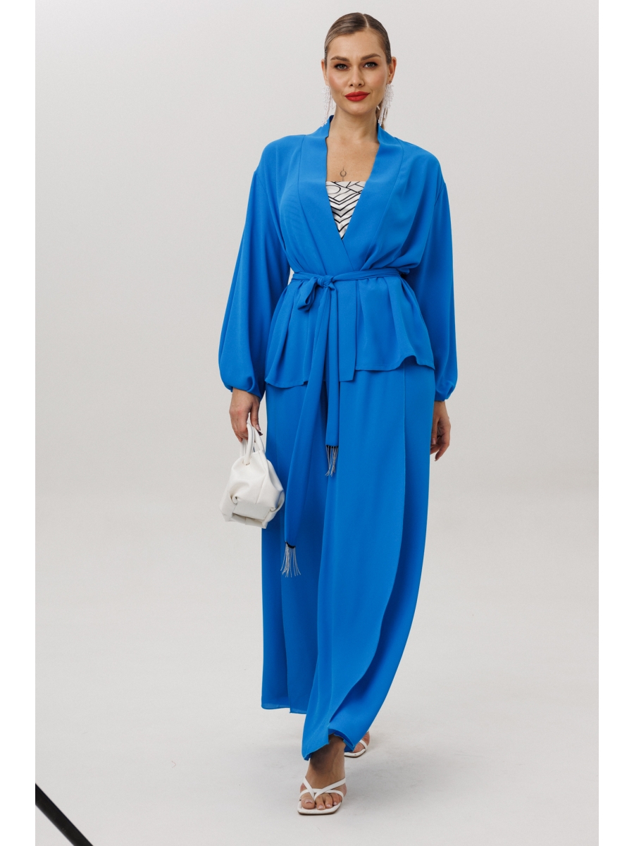 Элегантный вечерний костюм-двойка, состоящий из блузки свободного кроя и широких брюк.