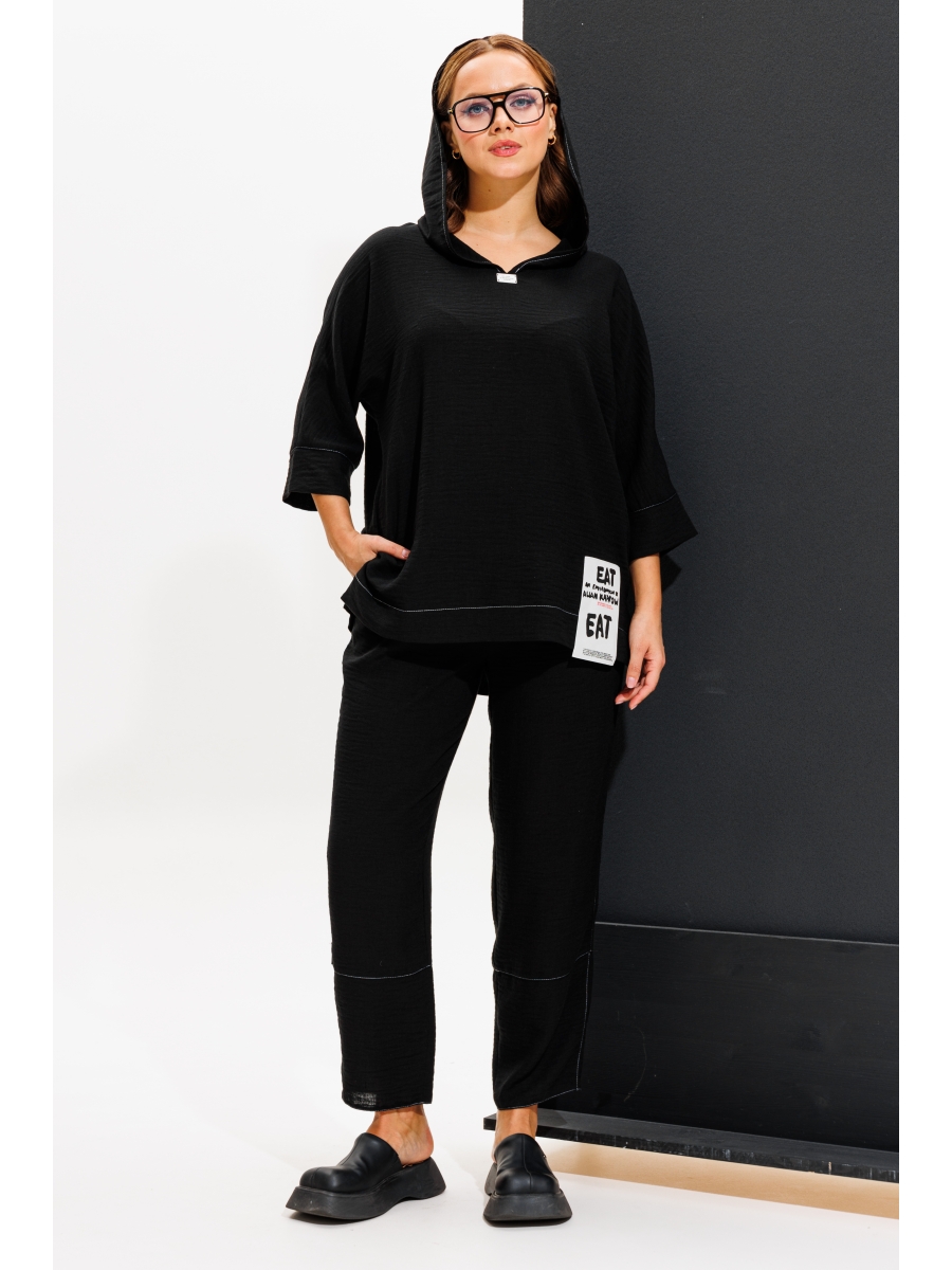 Комплкет легки и дышащий - идеальный вариант на лето. Отлично подойдет для повседневной носки. Блузка с капюшоном прямого силуэта с цельнокроенным руковом "летучая мышь", 3/4 длины с манжетой. Спинка длиннее полочки. По бокам разрезы.