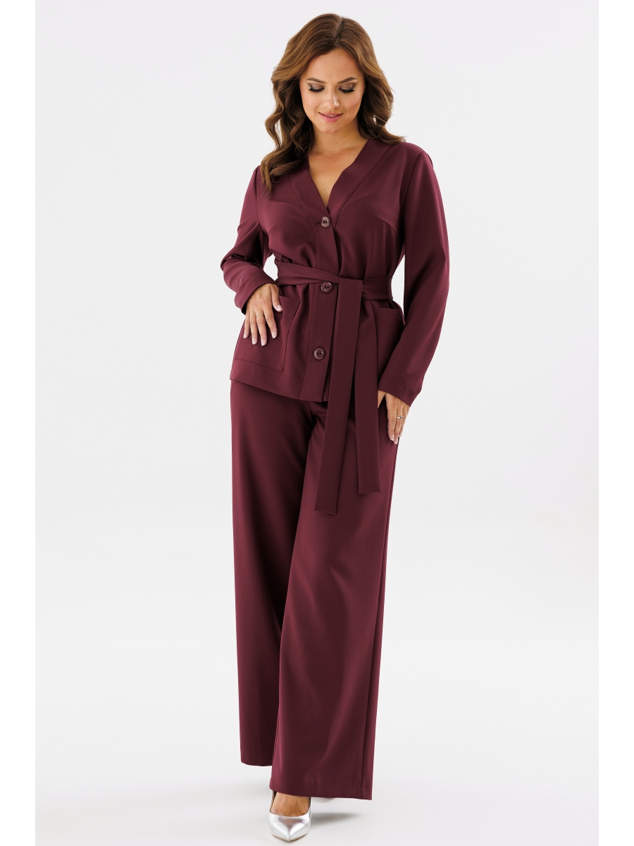 Эффектный брючный комплект из костюмно-плательной ткани состоит из прямого жакета и широких брюк.
