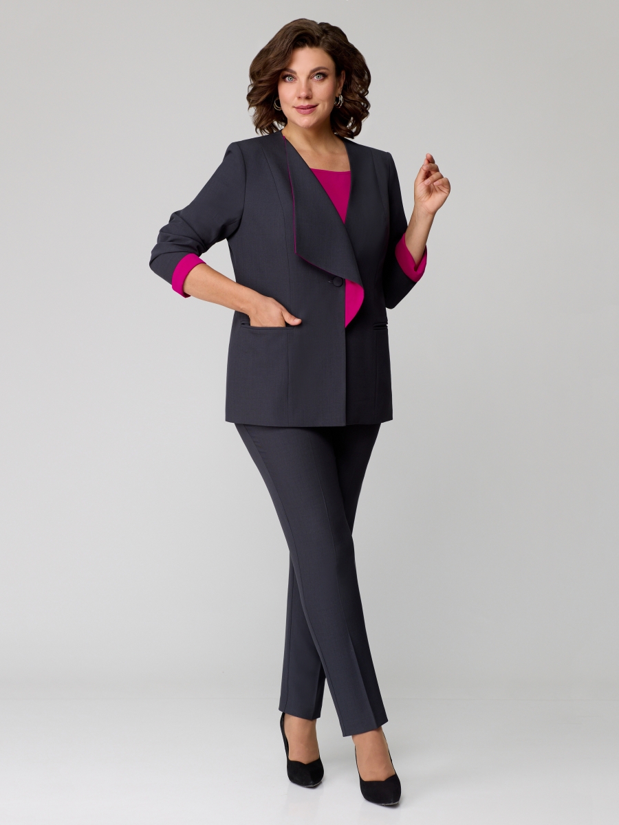 Жакет на подкладке с центральной застежкой на 1 петлю и пуговицу с асимметричным воротником и контрастной отделкой. По переду функциональные карманы. Спинка с рельефом выходящим из плеча и средним швом. Рукав втачной двухшовный с контрастной манжетой.
