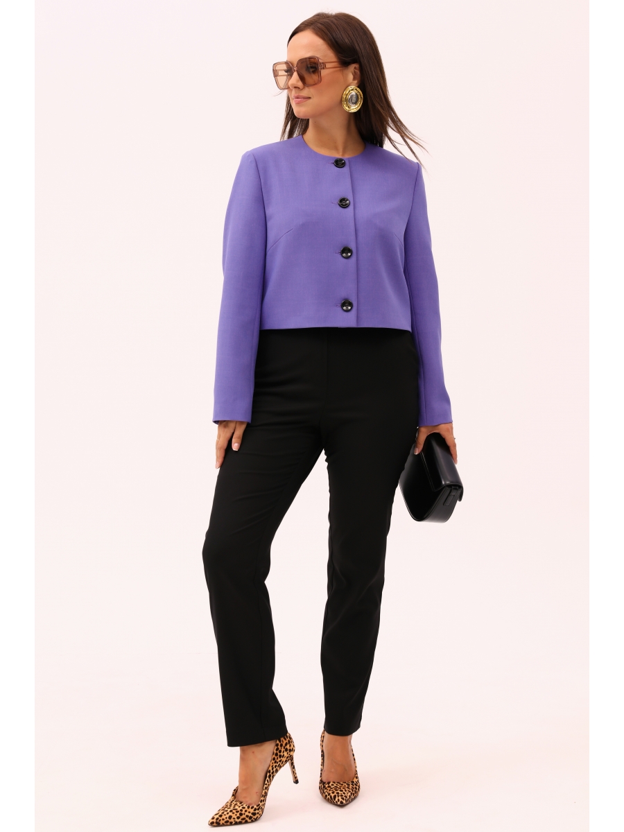 Лаконичный брючный комплект состоит из укороченного прямого жакета и зауженных брюк.