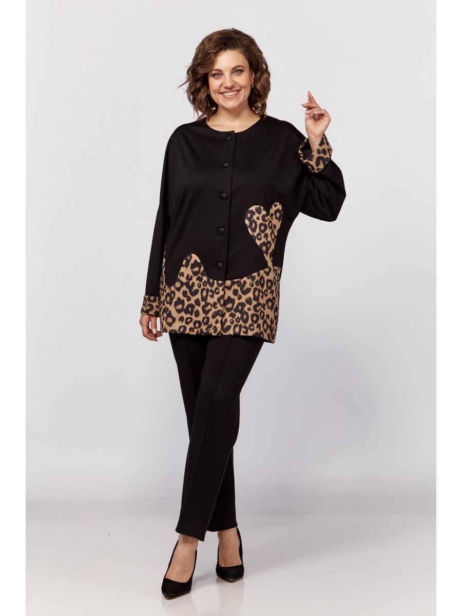 Жакет свободного облегания, длиной чуть ниже линии бедер, без подкладки, с центральной застежкой по переду на петли с пуговицами. Вырез горловины круглый, линия плеча слегка опущена, рукав длинный с отворачивающимся манжетом из отделочной ткани с эффектом замши, по низу переда фигурный подрез и деталь из отделочной ткани.