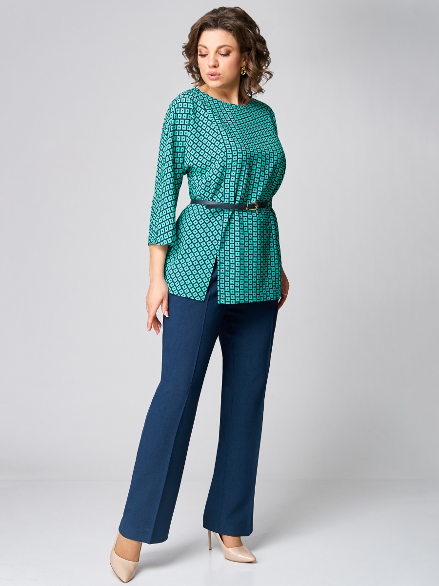Брюки прямые, застежка на тесьму-молнию в гульфике и пуговицу по центру переда. Пояс притачной с эластичной тесьмой в боковых швах брюк, которая обеспечивает максимально комфортную посадку на любой тип фигуры. Имеется съемный пояс.
