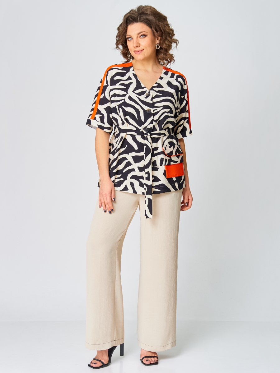 Блузка прямого силуэта выполнена из вискозной ткани. С контрастной оранжевой отделкой лампас по плечевому срезу и рукаву, клапану и мешковине кармана. Спущенная линя плеча, рукав короткий с отложной манжетой. По левой полочке заложена складка и имитация кармана. Спинка со средним швом. По бокам имеются разрезы. Застёжка центральная на 5 пуговиц и петель.