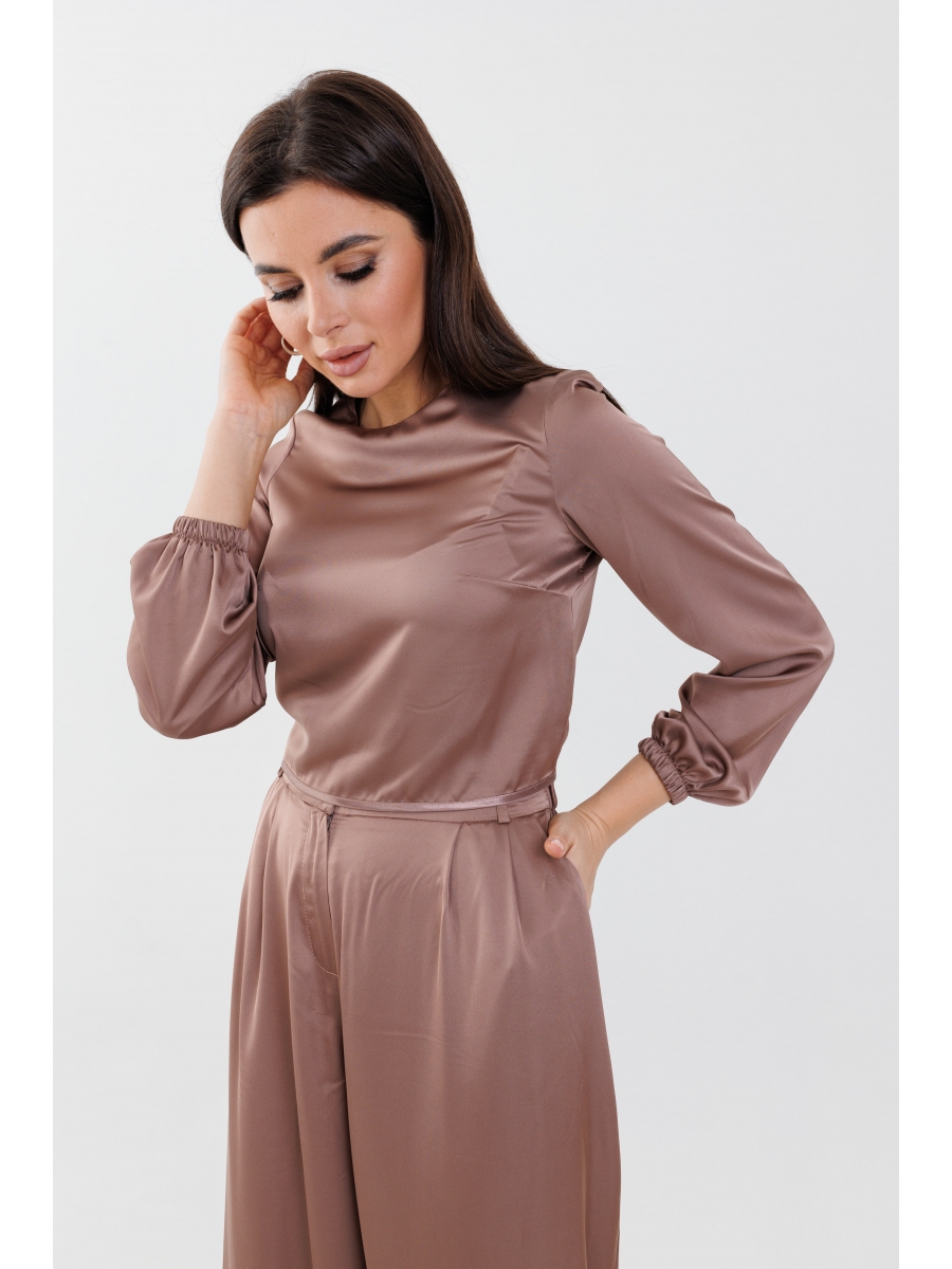 Блуза женская, полуприлегающего силуэта, длина до талии. Рукав втачной, длинный, низ на резинке. По переду нагрудные вытачки, по спинке слезка с застёжкой на петлю пуговицу. По низу блузы декоративные шнуры, которые позволят предать вашему образу необычность, женственность, особую изюминку.