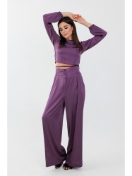 Брюки женские, высокая посадка, длинные, расширенные к низу. По переду защипы моделирующие фигуру и боковые карманы. По спинке талиевые вытачки. Притачной пояс на петли пуговицы, по переду застежка молния, по спинке вшита эластичная лента, есть шлевки.