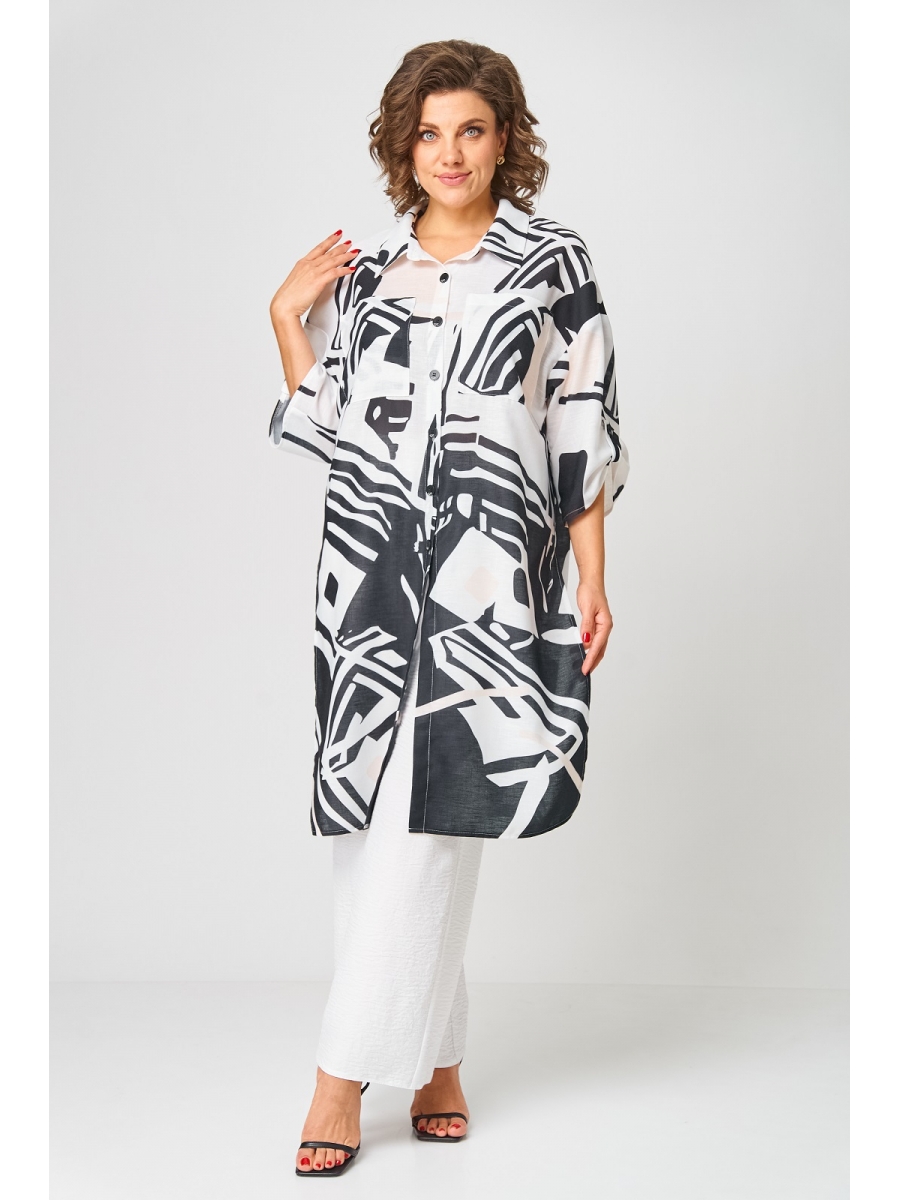 Элегантный женский комплект, состоящий из удлиненного льняного блузона с современным принтом и однотонных брюк из ткани с добавлением вискозы.