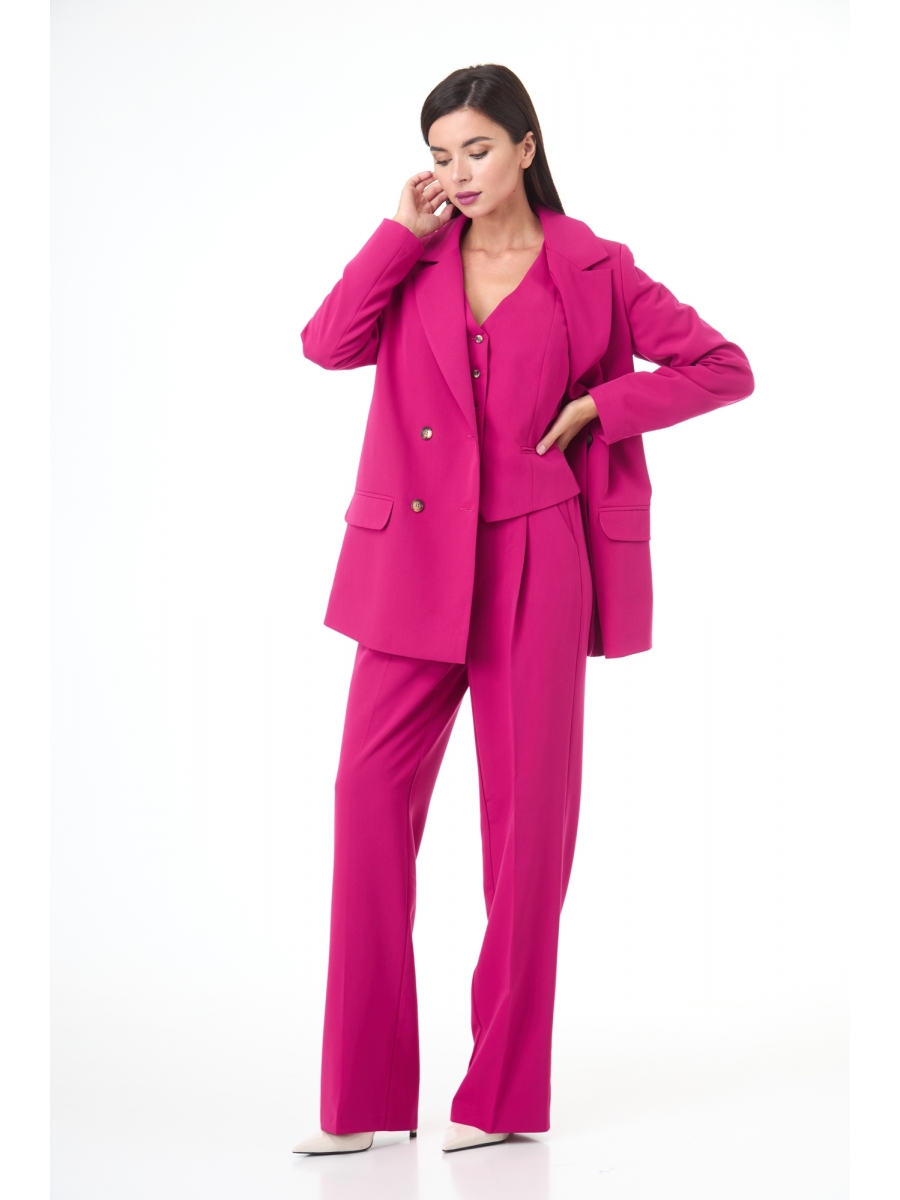 В комплект входят брюки, жакет и жилет. Сегодня сложно представить гардероб современной женщины без брючного костюма. Он актуален на всех мероприятиях, является базой офисной одежды и городской моды. Жакет двубортный, прямого свободного силуэта с втачными рукавами, отложным воротником и лацканами, функциональными прорезными карманами с клапаном. Спинка со средним швом. Жакет и жилет выполнены на подкладке. Жилет полуприлегающего силуэта, с рельефами по переду и спинке, v-образным вырезом горловины, застежкой на пуговицы, нерабочими карманами в рамку, по спинке регулируемый хлястик в области талии. Брюки классического покроя с завышенной линией талии, с боковыми функциональными карманами по переду, с притачным поясом. Комплект выполнен из однотонной ткани. Не упустите возможность приобрести комплект – он будет радовать вас не один сезон!