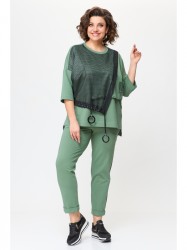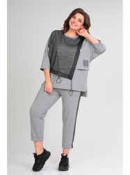 Удобный костюм выполнен из мягкого и уютного трикотажа. Брюки укороченные, свободного кроя с отворотом, будут прекрасно смотреться как на высоких, так и на миниатюрных девушках. В брюках функциональные боковые карманы, пояс на резинке, украшены крупной сеткой на лампасах. Джемпер свободного кроя, плечо приспущено, рукав ¾, украшен принтом в виде «штрихкода». Перед короче относительно спинки, по бокам разрезы, украшением служат отлетные детали со стяжками на крупных кольцах по низу. Сложный крой и функциональность костюма делает его особенным и самостоятельным. Оба изделия можно смело комбинировать с другими вещами и обувью Вашего гардероба.
