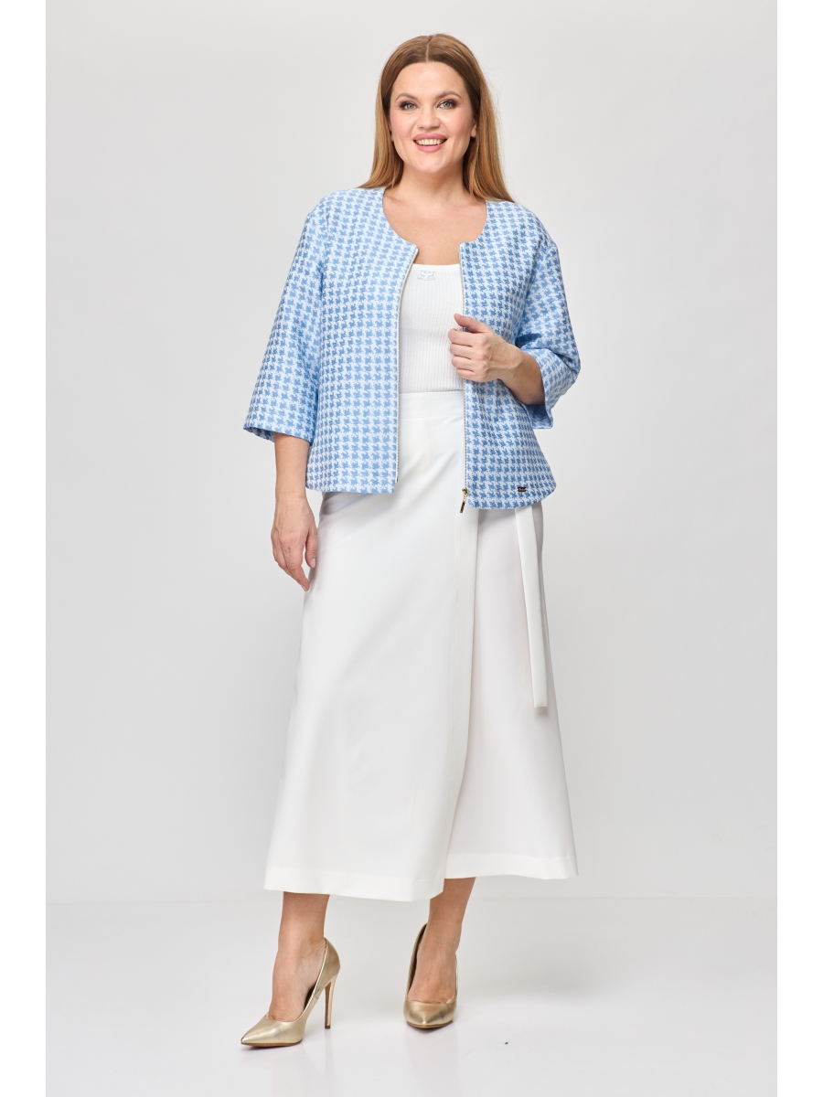 Жакет выполнен из стильной ткани «гусиная лапка» в приятной расцветке. Свободного прилегания с центральной застежкой на молнии, рукав ¾. В качестве декора по переду изделия - пришивная брошка.