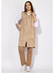 Жилет прямого силуэта. По переду карманы в фигурных рельефах. По спинке подрезные детали с декоративной нашивкой. Горловина оформлена капюшоном с кулисой. По бокам разрезы.