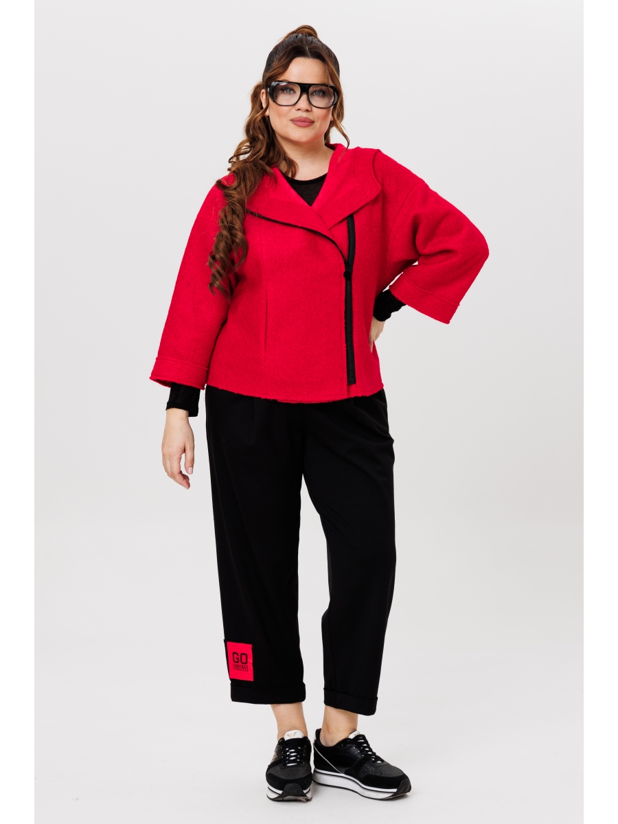Жакет из буклированного однотона, брюки — однотонный вискозный трикотаж. Жакет укороченный с капюшоном и объемными рукавами, по переду застегивается на асимметричную застежку — молнию, имеются карманы. Спинка цельная. Края жакета, рукава, борта и капюшона с открытыми срезами и отделочной строчкой.
