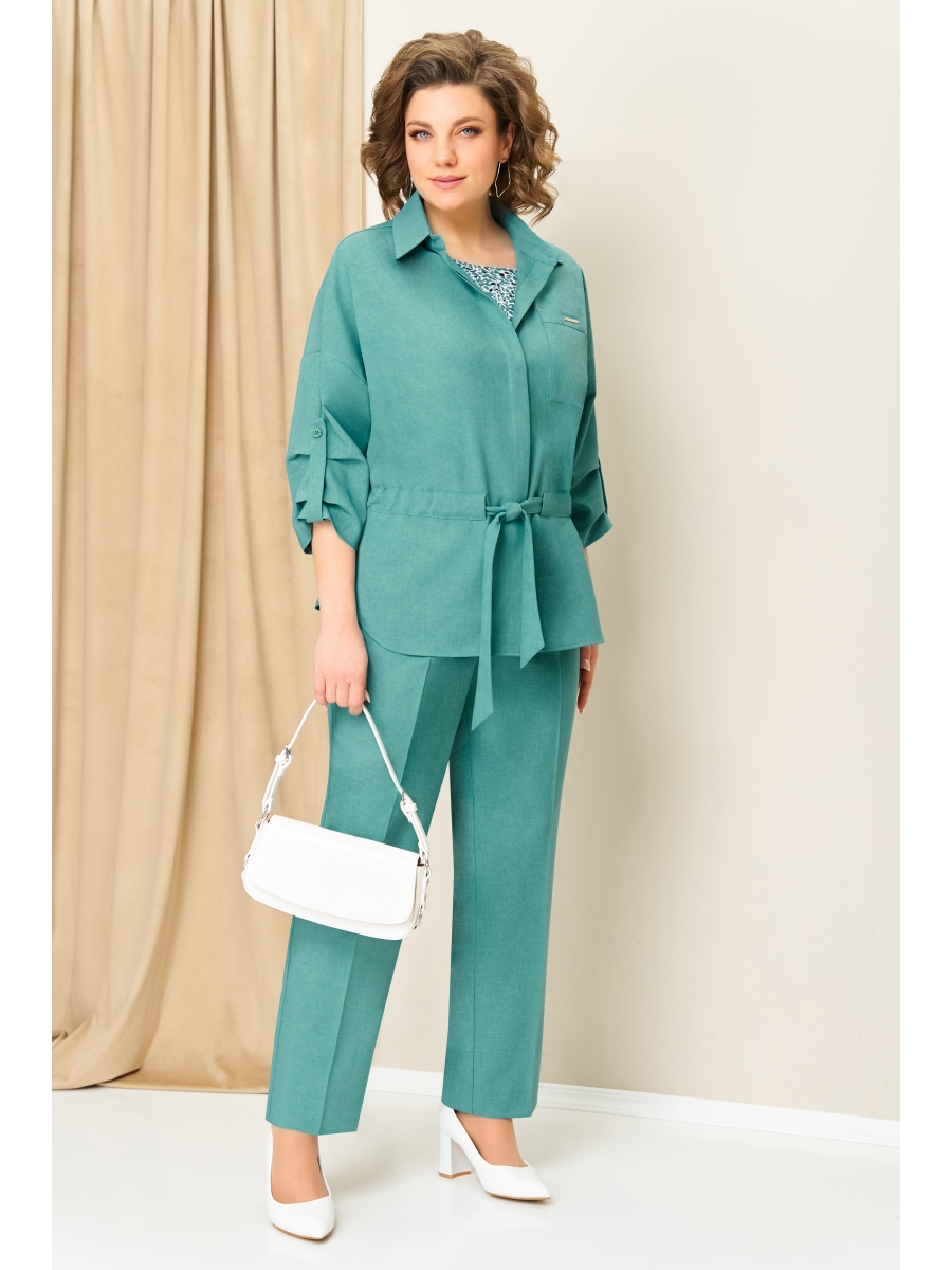 Жакет на потайной застежке, с пришивной кулисой и поясом, прямые классические брюки и блуза- универсальный комплект для различных вариантов носки. Элегантный рукав с патой на цельнокроеной основе.