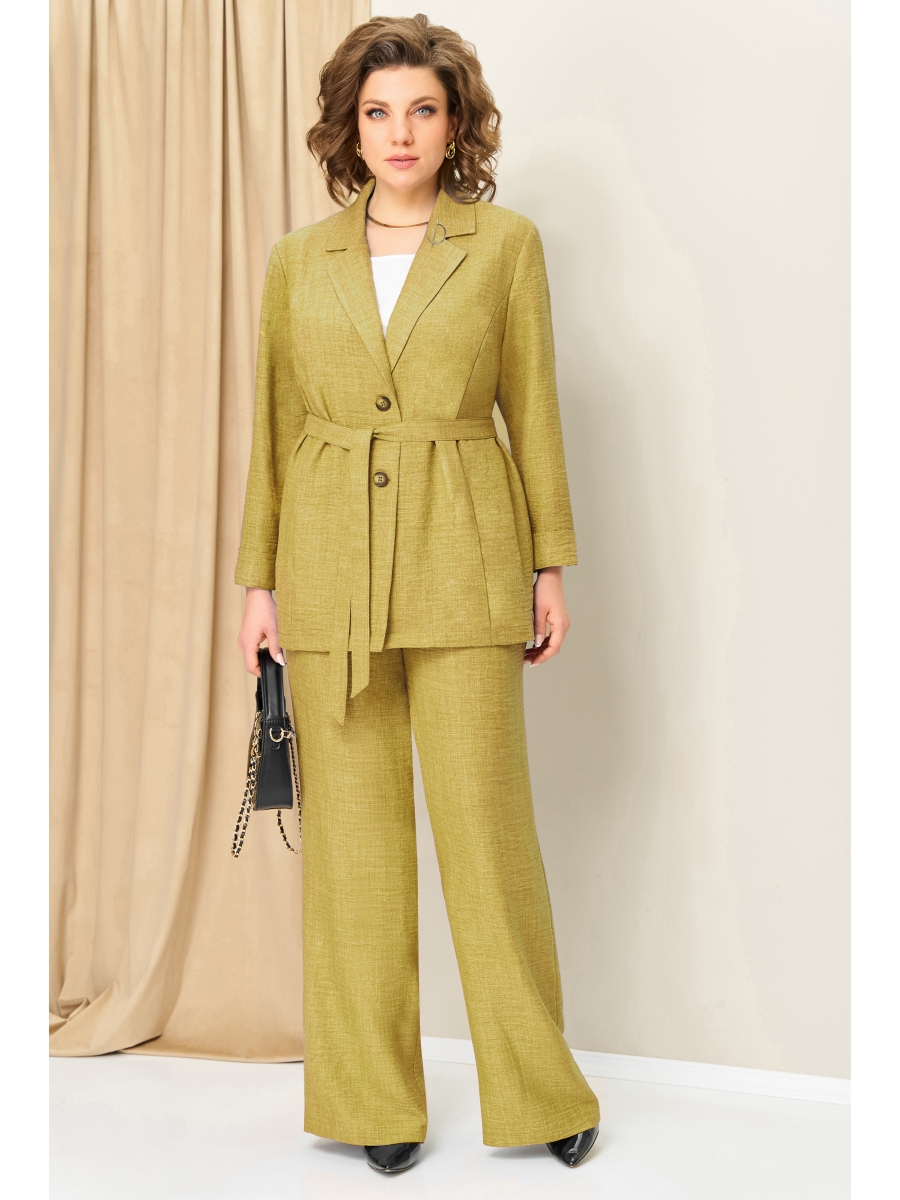 Жакет без подкладки с застежкой на пуговицы, с разрезами по бокам и съемным поясом. Рукав жакета втачной, с отворотом.