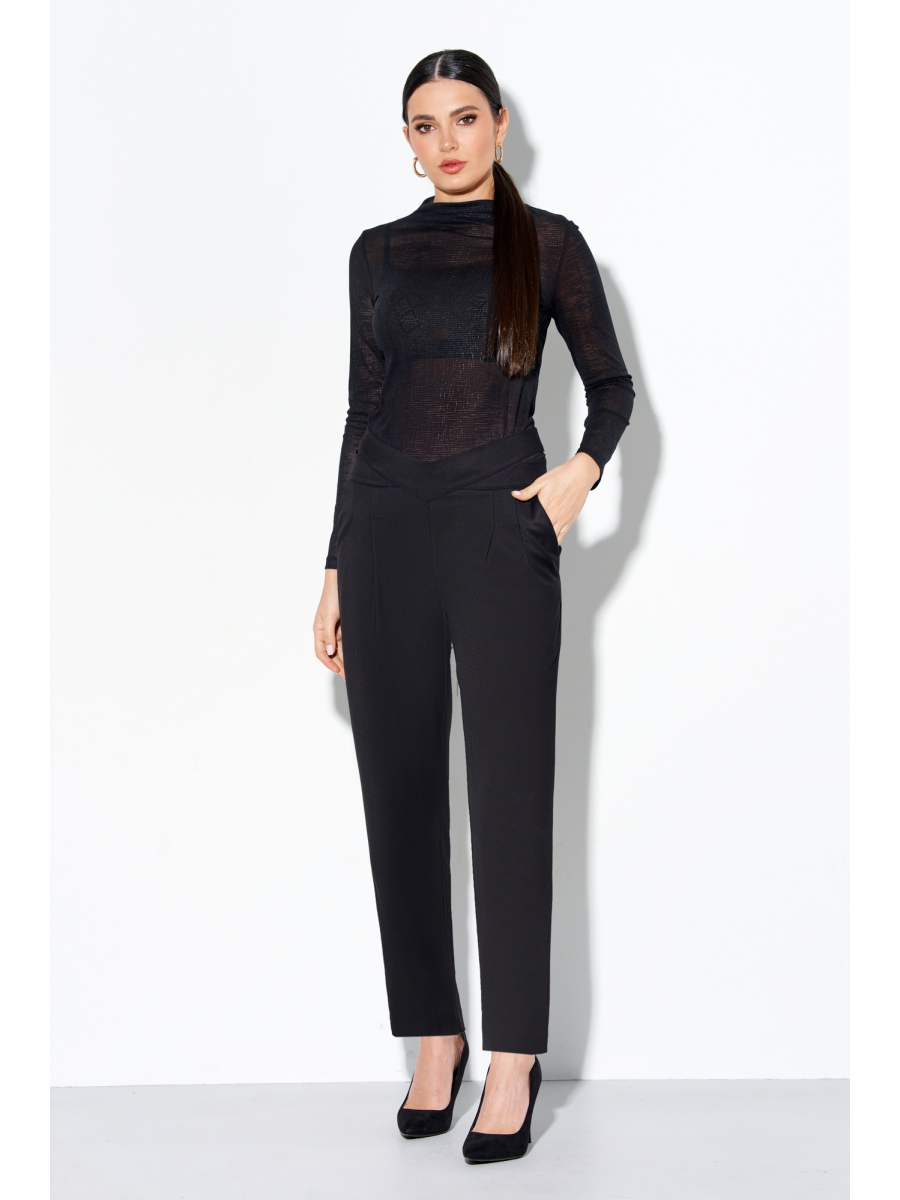 Брюки полуприлегающего силуэта, зауженные к низу, притачной декоративный пояс с вырезами по линии талии, в боковых швах карманы, по спинке застежка на потайную молнию.