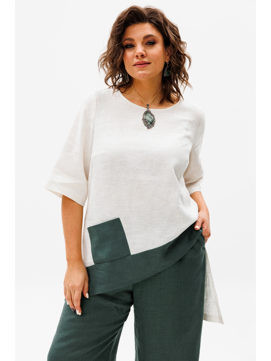 Ассиметричная блуза с карманом и брюки на резинке с карманами составляют идеальный ансамбль на лето.