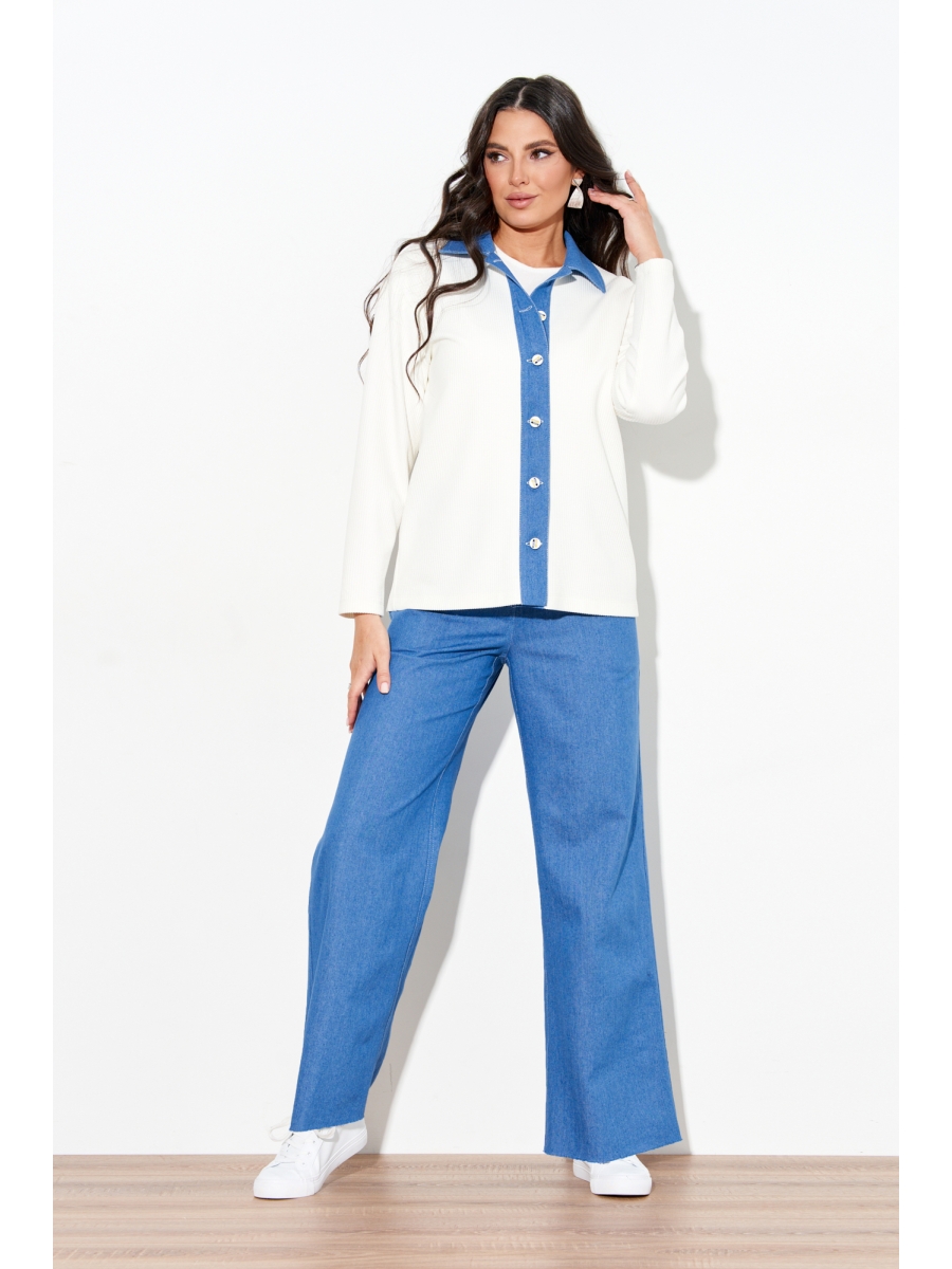 Рубашка из натурального трикотажного полотна свободного силуэта со втачными рукавами, рубашечным воротником и планкой-застежкой из джинсовой ткани в тон брюк.
