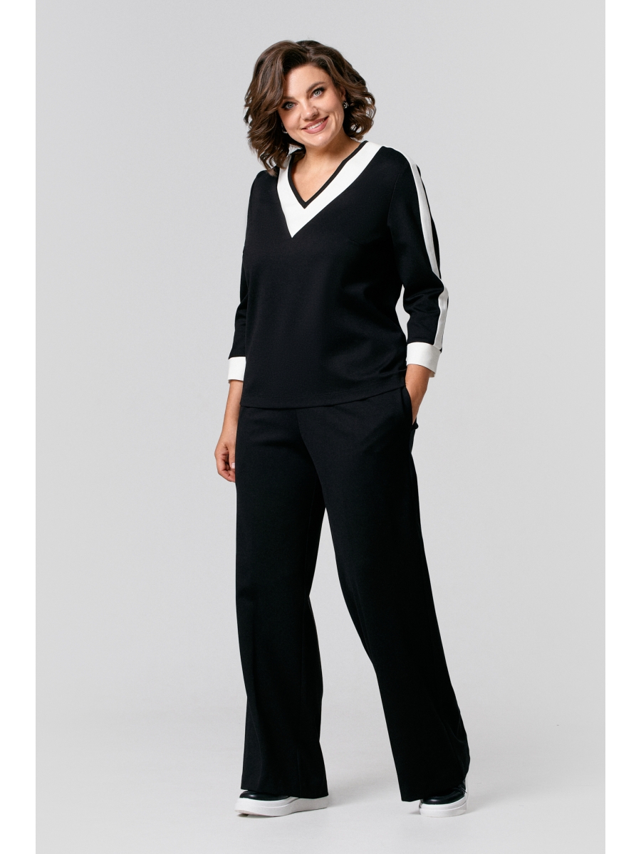 Костюм женский полуприлегающего силуэта с брюками и джемпером выполнен из трикотажного полотна средней плотности.