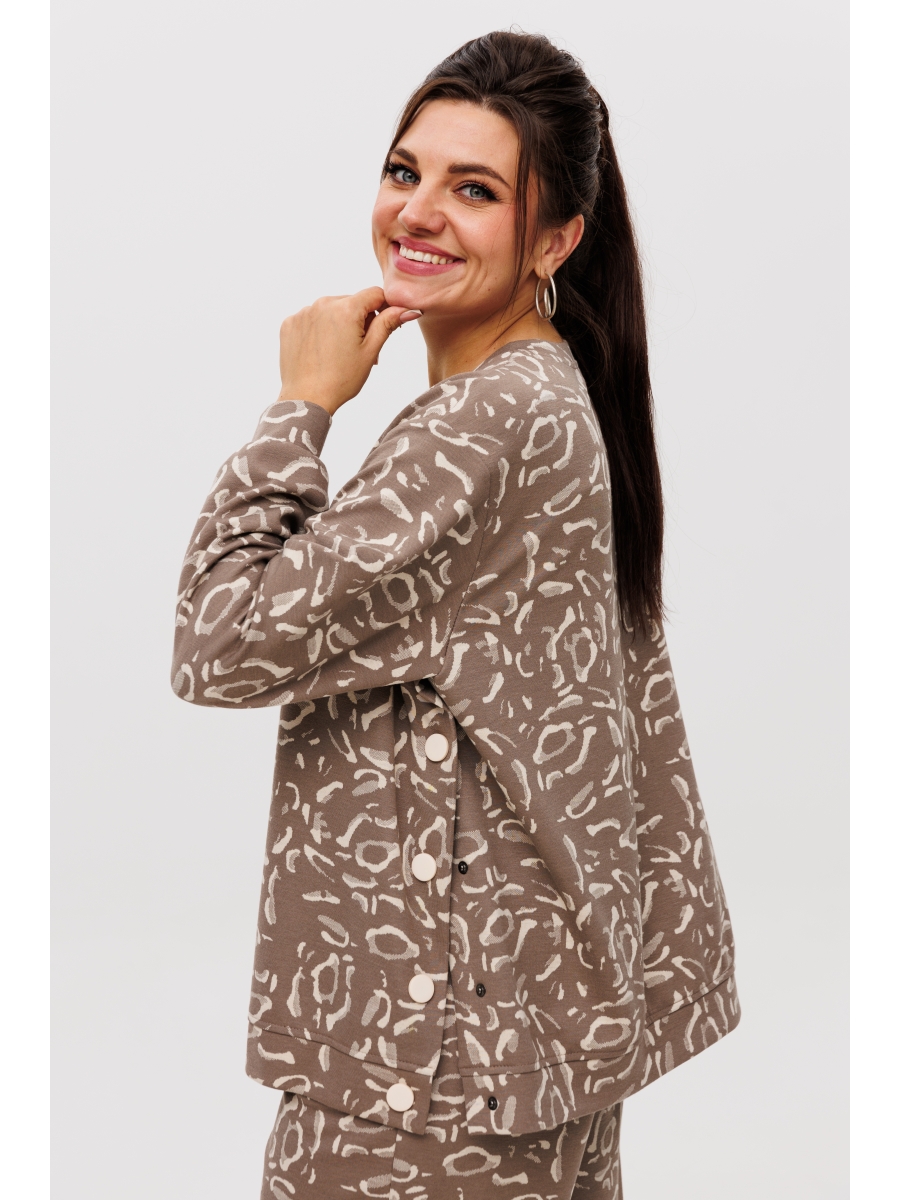 Свитшот с втачным рукавом дополняет комплект, а функциональные кнопки по бокам не только украшают изделие, но и позволяют регулировать его силуэт по своему желанию.