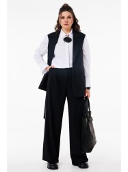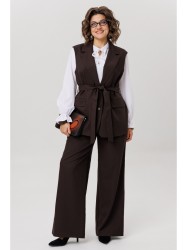 Этот элегантный костюм, состоящий из жилета и брюк, воплощает в себе утонченность и уверенность. Полуприлегающий силуэт жилета мягко подчеркивает линии фигуры, создавая гармоничный баланс между строгостью и женственностью. Однобортная застёжка на петли и пуговицы придает образу аккуратность и завершенность, а отложные лацканы воротника добавляют ноту классической сдержанности.