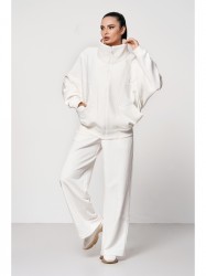 Бомбер свободного силуэта с рукавами "летучая мышь" и функциональными карманами по переду застегивается на молнию. Низ бомбера и рукавов выполнены из трикотажного полотна в рубчик (резинка) "кашкорсе" в тон основной ткани.