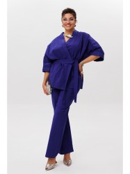 Кимоно свободного кроя с фигурным запахом мягко драпируется, подчёркивая силуэт, но не сковывая его. Рукав 3/4 с широкой манжетой добавляет динамики, а отсутствие застёжек делает образ ещё более непринуждённым. Съёмный пояс позволяет варьировать степень выразительности.