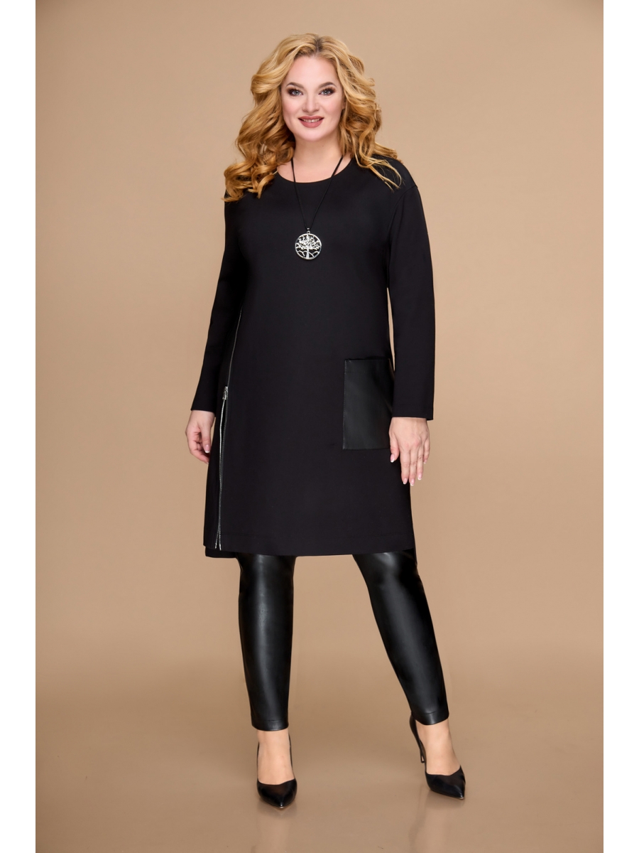 Туника свободного покроя со спущенным плечевым поясом. Перед с асимметричной молнией и накладным карманом из эко-кожи. Спинка цельнокроеная. Рукав длинный, втачной. Туника длиной выше уровня колена, с удлинённой спинкой.