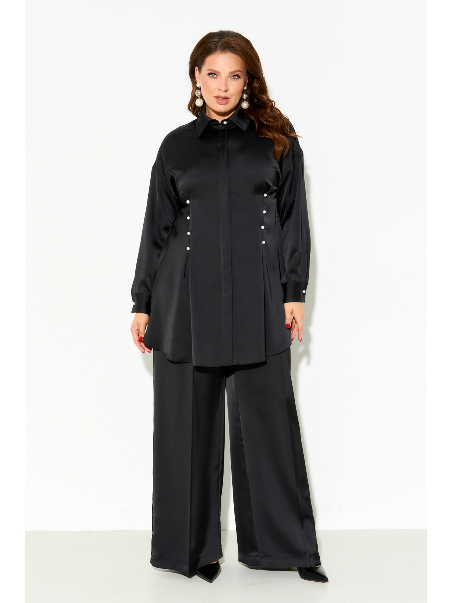 Женский костюм полуприлегающего силуэта, состоящий из рубашки и брюк, выполнен из мягкой стуящейся ткани средней плотности.