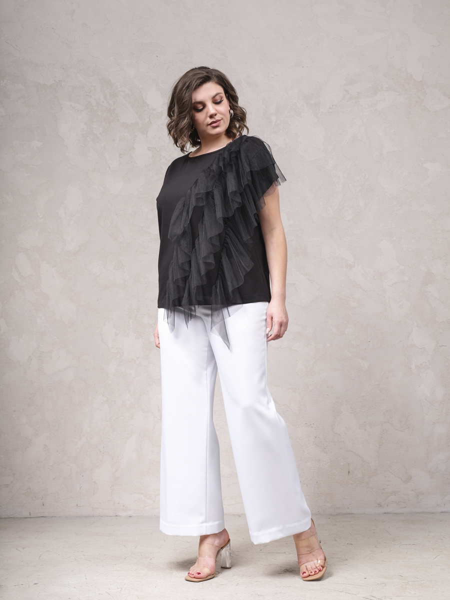 Блуза из тонкого натурального трикотажа, по переду элегантная отделка из фатина, с цельнокроеным рукавом.