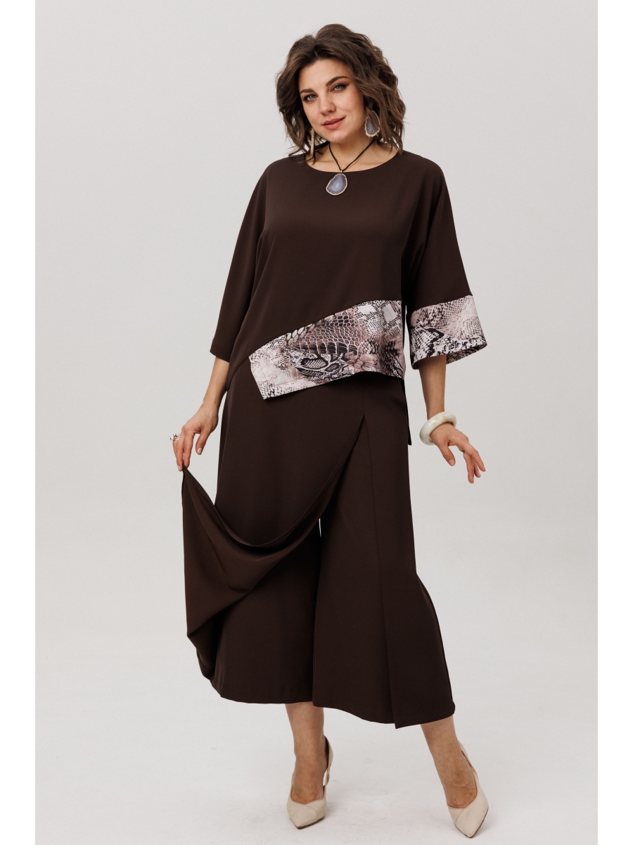Сочетание строгого силуэта и лёгкой небрежности в цвете «древесная змея». Его основу составляет блузон шоколадного оттенка, оживлённый тонким змеиным узором. Он свободно обрисовывает фигуру, смягчая линии цельнокроеными рукавами. А его главная деталь - фигурный, словно волной очерченный низ, который придаёт статичному крою неожиданную динамику.