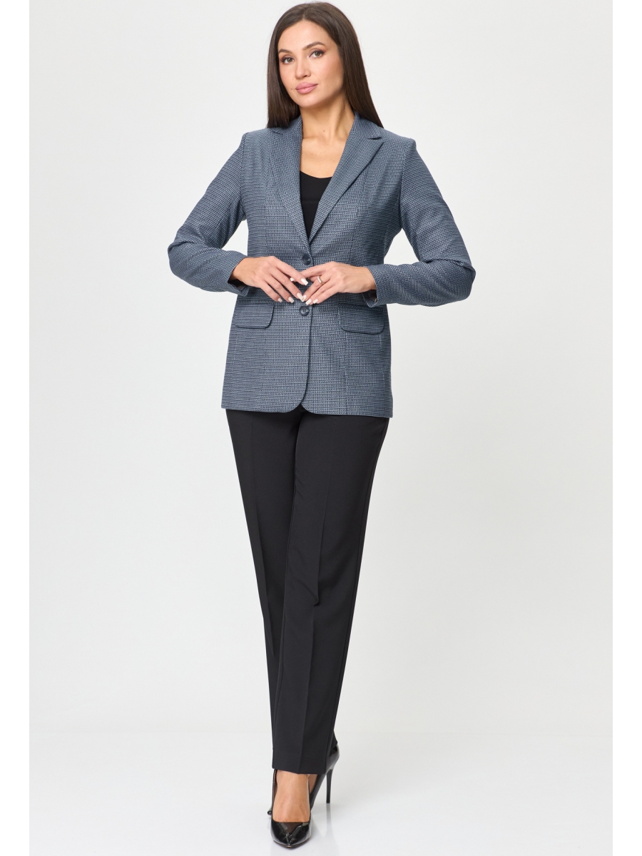 Жакет удлиненный, полуприлегающего силуэта с центральной бортовой застежкой на пуговицы до линии перегиба лацкана. Спереди рельефные швы от плечевого шва, отрезной бочок и карман с клапаном. Спинка с рельефами от плечевого шва. Рукав втачной, двухшовный. Воротник пиджачного типа. Жакет на подкладке.
