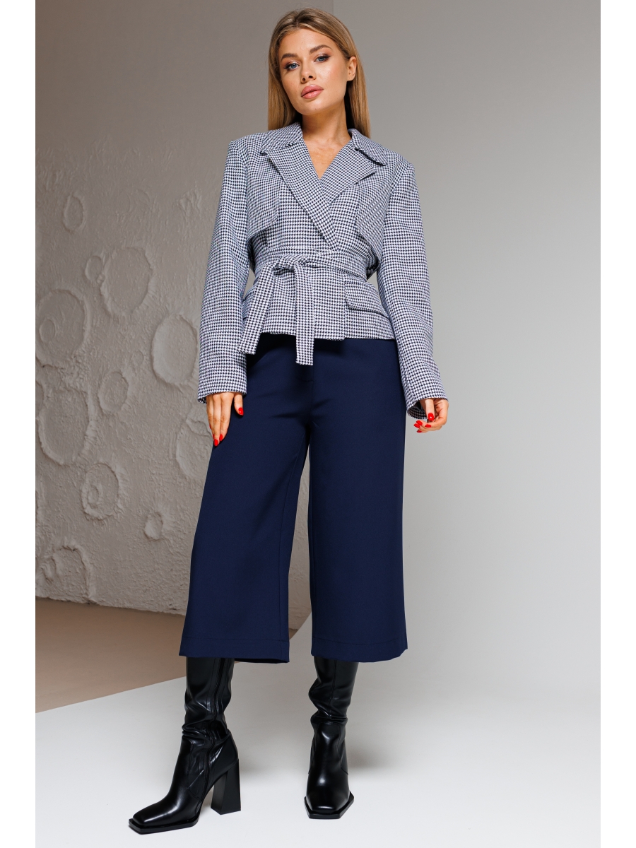 Брюки-кюлоты прямого силуэта. По талии притачной пояс, частично на резинке для лучшего прилегания. По переду в боковых швах прорезные карманы с наклонным входом. По переду застежка на тесьму-молнию.