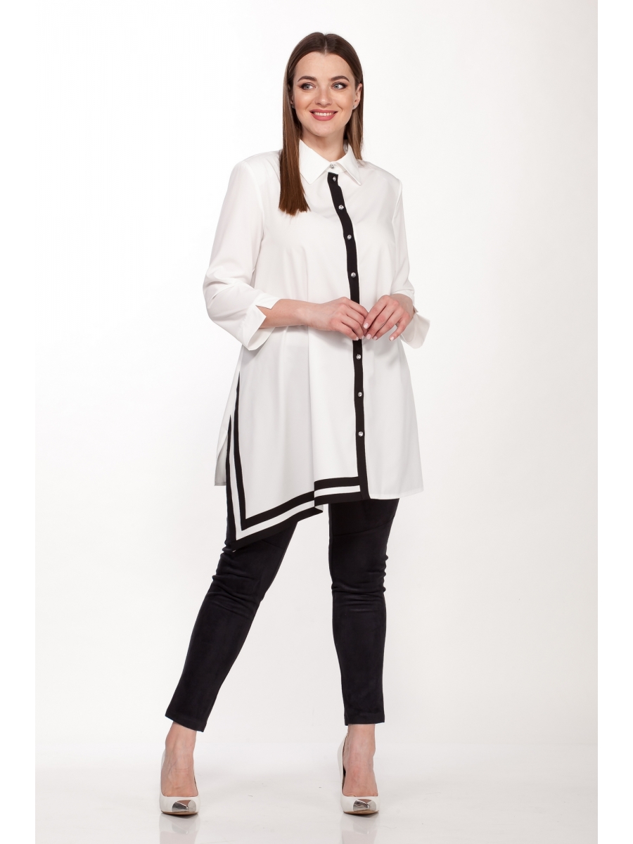 Блузка асимметричная выполнена из тонкой блузочной ткани, свободного силуэта с одной стороны по полочке расширенная к низу, в боковых швах разрезы, воротник на стойке,планка втачная, застежка на петли и пуговицы. Рукав втачной 3/4 с притачным манжетом с разрезом.