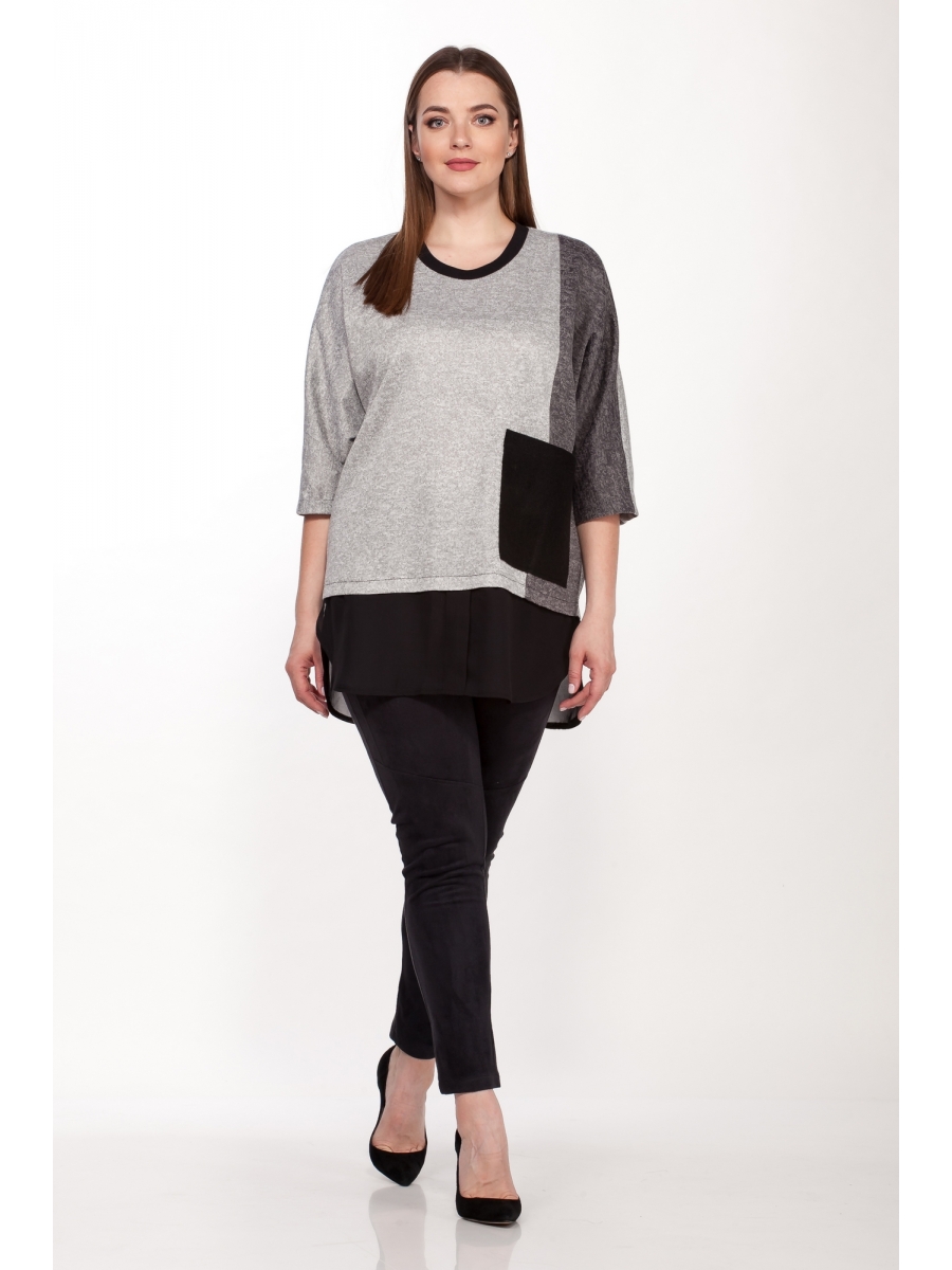 Туника полуприлегающего силуэта, выполнена из трикотажа с добавлением спандекса, с цельнокроеным рукавом. Полочка и рукав украшены сеткой на контрасте с основной тканью изделия. На полочке выполнен накладной карман из ткани контрастного цвета, по переду и спинке пришита отделка из тонкой полупрозрачной ткани.