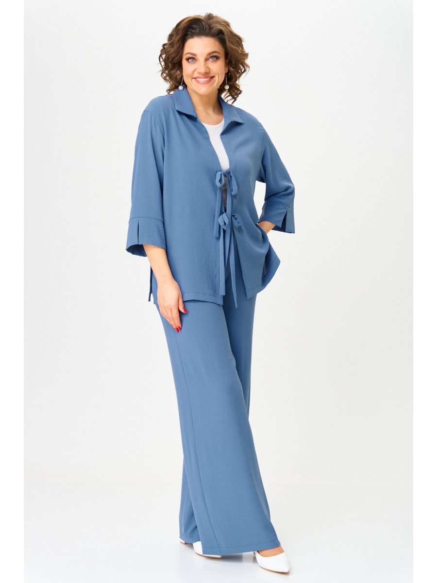 Жакет прямого кроя с втачным рукавом. Линия плеча слегка спущена. Застежка в виде завязок придает образу игривость и женственность. По горловине отложной воротник. Рукав длиной 3/4 заканчивающейся притачной манжетой с разрезом. В боковых швах разрезы.