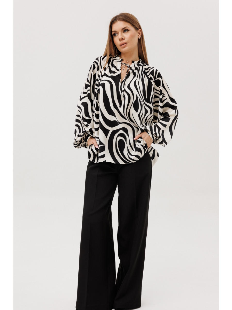 Блузка свободного силуэта (стиль оверсайз) с рукавом реглан. Горловина с разрезом спереди и притачной планкой с рюшей. Рукав на манжете. Модель без подкладки, не просвечивает.