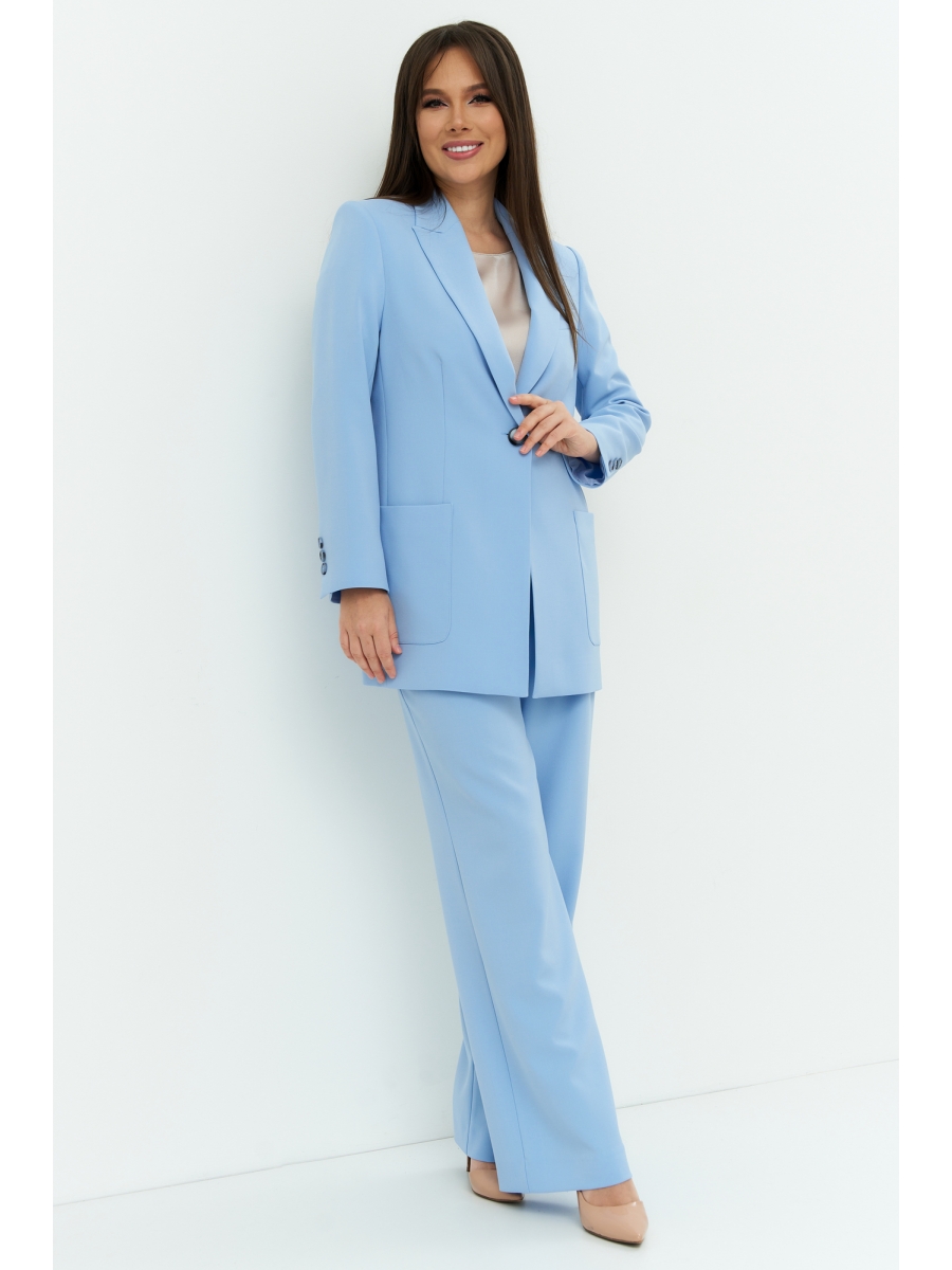 Оформить заказ →Стильный комплект из жакета, блузы и брюк. Удлиненный жакет прямого кроя, на подкладке с центральной застежкой на пришивную пуговицу. Выполнен из костюмной ткани. Дополнен боковыми накладными карманами. Рукав встачной. Блуза прямого кроя, выполнена из шифона. Широкие брюки прямого кроя с притачным поясом, с застежкой на пришивную пуговицу и молнию. Посадка слегка завышена. Дополнены функциональными боковыми карманами.