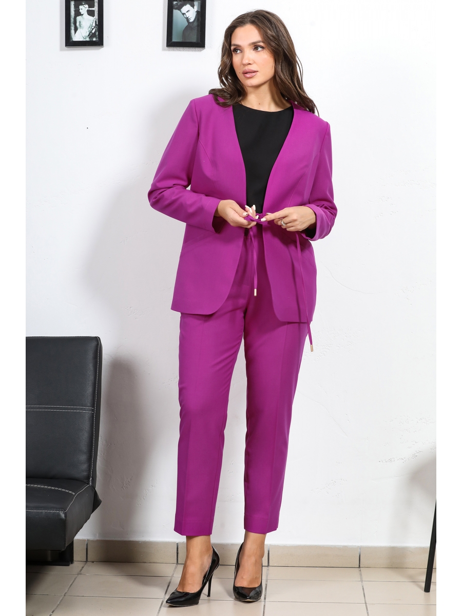 Жакет без застежки на завязке, перед на подкладке, рукав двухшовный, втачной. Брюки укороченные, прямые, пояс частично с эластичной тесьмой.