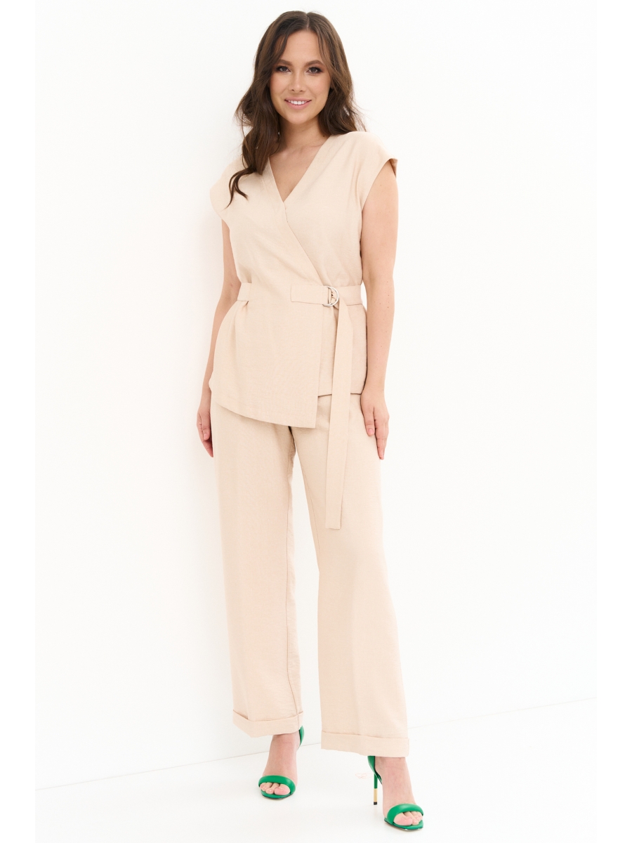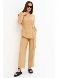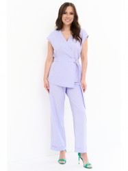 Стильный элегантный комплект из блузы и брюк. Блуза свободного кроя, с коротким рукавом, с застежкой на запах. Приталена несъемным поясом, выполненным из основной ткани. Брюки классического прямого кроя, с притачным поясом, дополненным эластичной тесьмой. Застежка на молнию и пуговицу. Брюки дополнены боковыми и задними накладными карманами.
