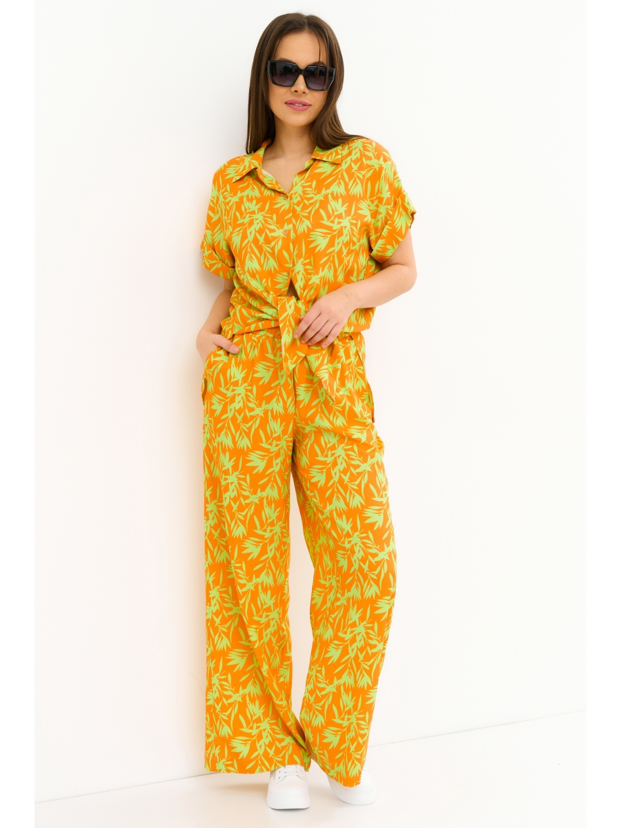Стильный яркий комплект пижамного типа. Выполнен из нежного комфортного штапеля. Блуза рубашечного кроя с центральной застежкой на пришивные пуговицы. Воротник отложной, рукав слегка спущен. Брюки свободного прямого кроя с притачным поясом, дополненным эластичной тесьмой. По бокам расположены удобные карманы.