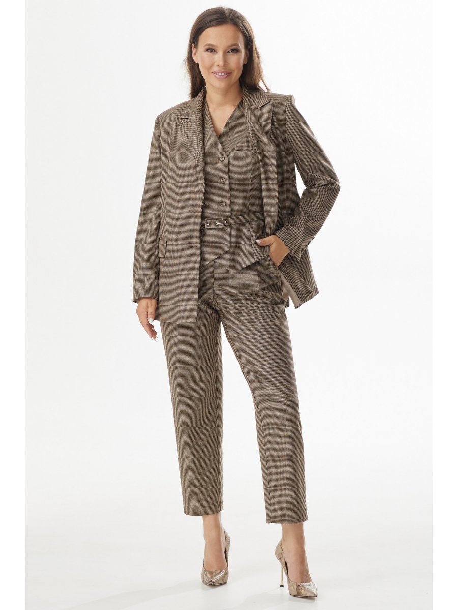 Жакет свободного кроя, на подкладке, с центральной застежкой на пришивную пуговицу. Дополнен боковыми прорезными карманами с клапанами. Рукав втачной. Двубортный жилет приталенного силуэта, на подкладке, с отложным воротником, с центральной застежкой на пришивные пуговицы. Пояс в комплекте.