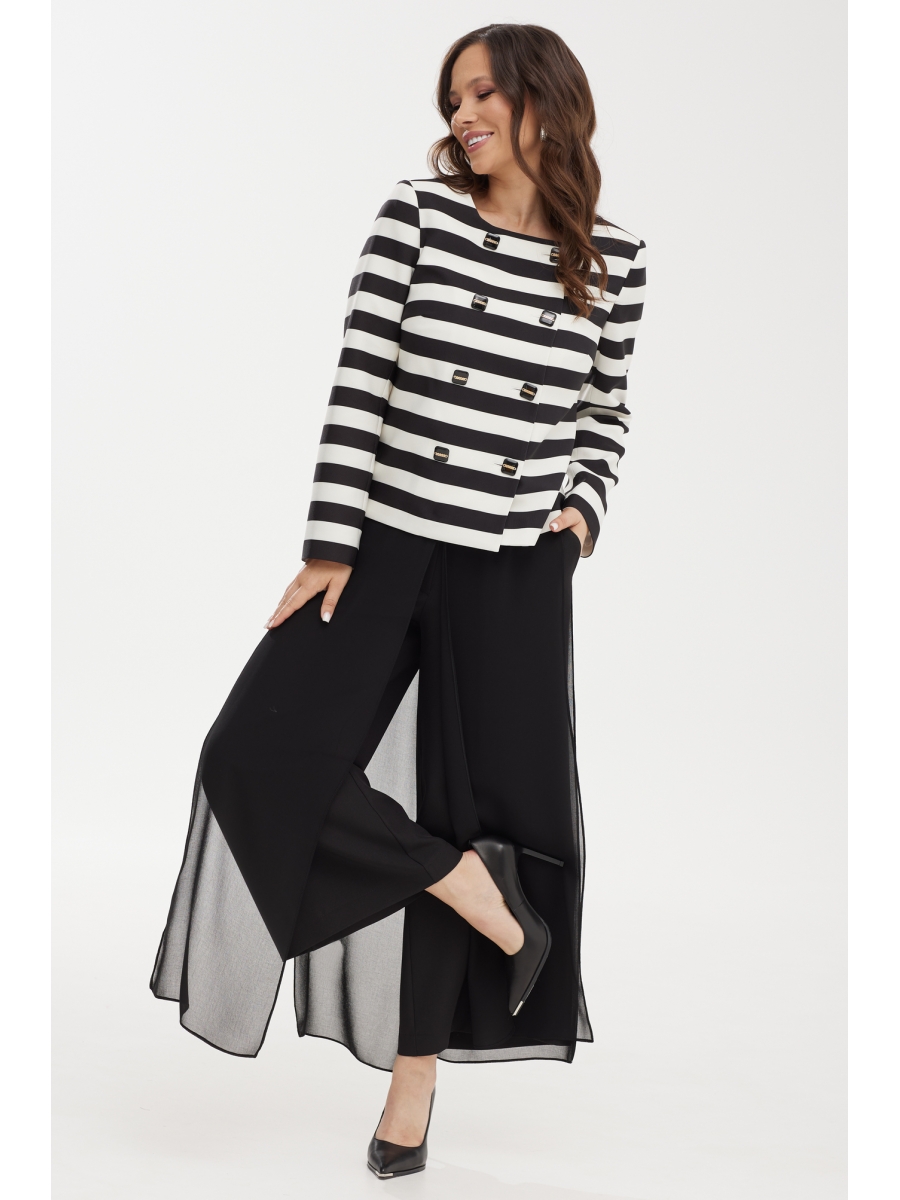 Брюки кюлоты прямого кроя с притачным поясом, дополненным эластичной тесьмой. Застежка гульфик на пуговицу и молнию. Брюки дополнены удобными боковыми карманами. Неповторимый шарм брюками придают элементы из шифона, которые закреплены по шву пояса и свободно и эффектно развеваются при движении и ходьбе.