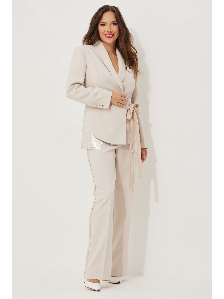 Жакет полуприлегающего силуэта, на подкладке, с центральной застежкой на потайные кнопки. Так же жакет дополнен пришивным поясом. Рукав втачной. Воротник отложной. Спинка и отделочные элементы жакета и брюк выполнены из слегка мерцающей поливискозной ткани, что придает комплекту неповторимый шарм. Так же жакет дополнен вставками из сетки с мерцающими пайетками.