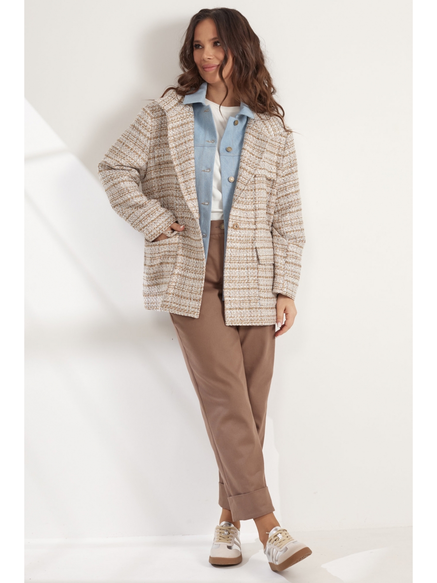Жакет свободного кроя со слегка спущенным рукавом. Выполнен как имитация джинсовой рубашки и жакета. По талии дополнен скрытой кулиской с фиксаторами, за счет которой, по желанию, можно присборить жакет. Дополнен функциональными карманами. Жакет на подкладке с центральной застежкой на потайную кнопку. Выполнен из фактурной ткани "рогожка".