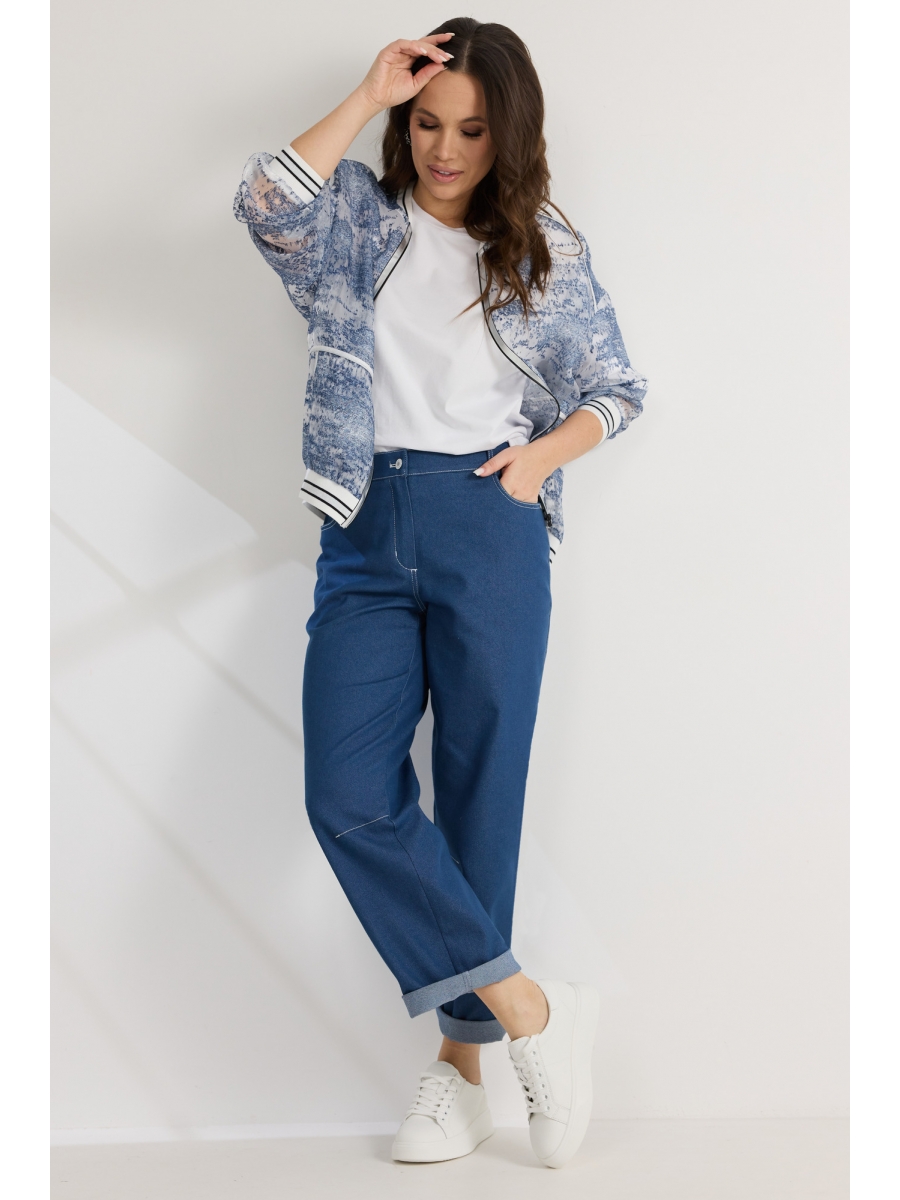 Бомбер свободного кроя с центральной застежкой на стильную молнию. Выполнен из полупрозрачной органзы с джинсовым принтом. Горловина, низ бомбера и манжеты выполнены из притачного довяза. Бомбер дополнен боковыми карманами.