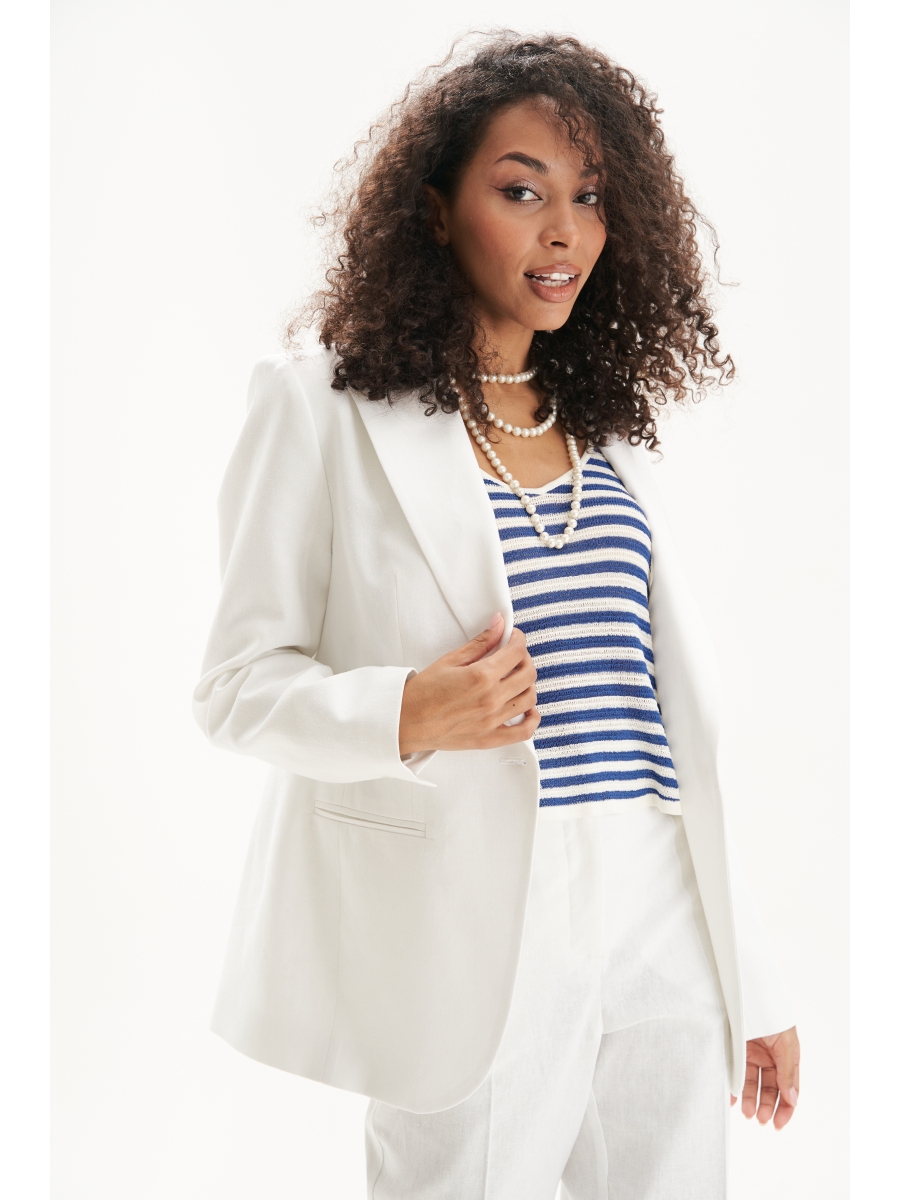 Стильный и универсальный комплект из натурального льна включает прямые белые брюки и удлинённый жакет с аккуратным воротником и застёжкой на пуговицу. Модель подчёркивает силуэт, при этом оставаясь максимально комфортной за счёт дышащей, натуральной ткани. Внутренняя продуманность — залог внешней элегантности.